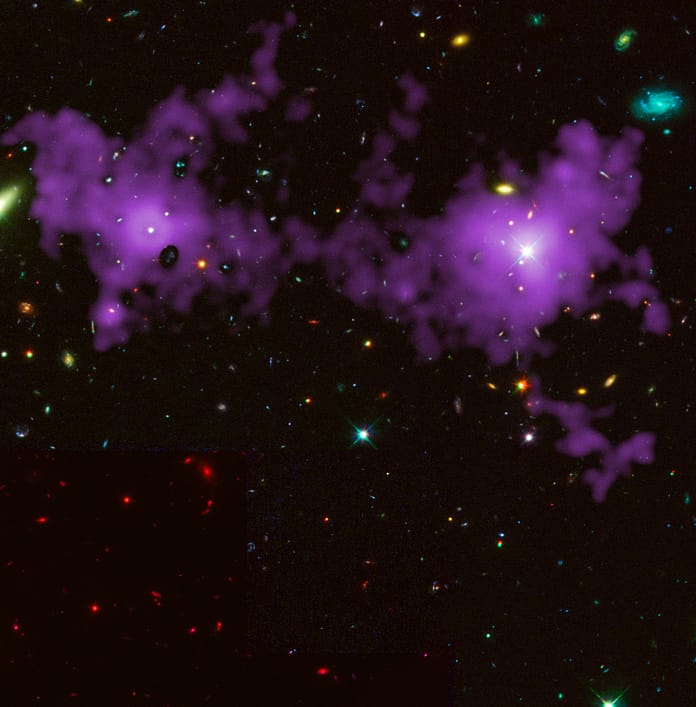Immagine della porzione di cielo nella direzione del MUDF (MUSE Ultra Deep Field, la regione di cielo oggetto delle osservazioni MUSE). Sullo sfondo, a colori, le galassie osservabili davanti e dietro al filamento cosmico, visibile in viola. Le due galassie agli estremi della struttura, avvolte da nubi di gas, ospitano al centro buchi neri supermassicci, visibili in azzurro.