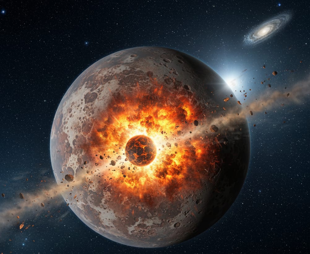 A questo punto le teorie divergono: una sostiene che originariamente la Luna fosse un pianeta che entrò in collisione con la Terra, creando detriti che si combinarono sino a formare, per l’appunto, la Luna; l’altra teoria asserisce che la Luna, mentre vagava per il nostro sistema solare, venne catturata e trascinata in orbita dalla gravità della Terra. Nessuna delle due teorie è convincente in virtù della mancanza di qualsiasi riscontro a sostegno delle ipotesi, in quanto né la Luna né la Terra sembrano aver subìto frantumazioni a causa di un remoto incontro ravvicinato. Nello spazio non sono presenti detriti indicanti una passata collisione, né sembra che la Terra e la Luna si siano sviluppate nel medesimo arco temporale.