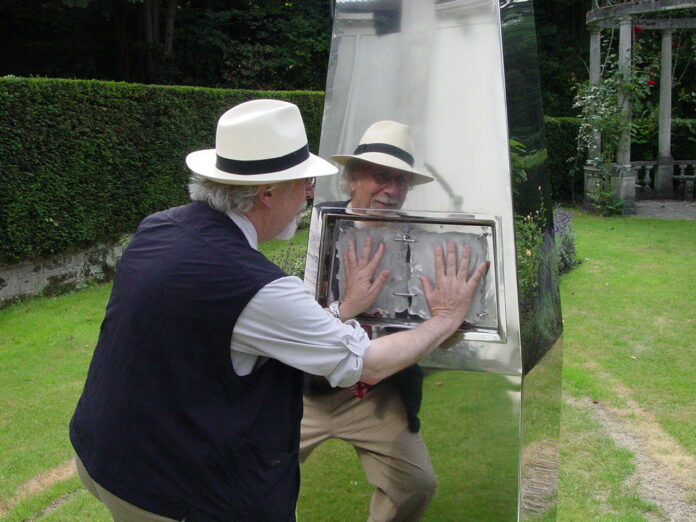 Sarfatti scherza con un’opera d’arte nel giardino di Uri Geller. (foto: Paola Harris)
