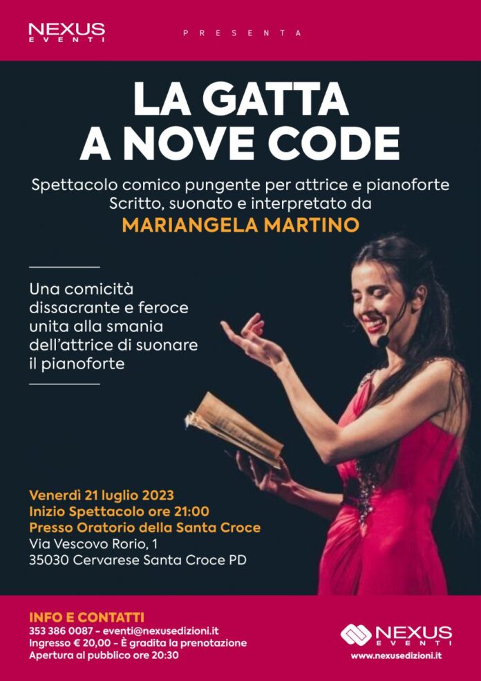 Se il gatto a nove code è un arnese di tortura, MARIANGELA MARTINO è uno strumento di risata. Tra una fustigata e l’altra, porta in scena LA GATTA A NOVE CODE, uno spettacolo comico e pungente da lei scritto, interpretato e suonato al pianoforte.