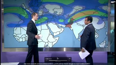 “I monsoni superpotenti confondono i meteorologi. Il corrispondente scientifico Tom Clarke ricorda che la jet stream è molto importante nella determinazione di modelli meteorologici di ampio raggio. Il flusso attuale risulta spaccato in due. Un braccio si è diretto verso nord, l'altra diramazione a sud. Il lembo in mezzo è occupato dalla zona in cui si è manifestata la siccità, la regione della Russia. La circolazione d'aria si è bloccata sulla Russia per molto più tempo del normale, causando le temperature estreme e gli incendi. Ciò che sta avvenendo in Pakistan è ancora più strano. Il braccio meridionale del flusso è avanzato tortuosamente e, valicato l'Himalaya, si è rivolto nel Pakistan nord-occidentale. Gli esperti presso l'Ufficio meteorologico riferiscono che questo è molto insolito. Il risultato è che il movimento rapido e vorticoso della jet stream ha contribuito a 'succhiare' il caldo umido dell’oceano, generando monsoni ancora più veloci e più elevati nell'atmosfera rispetto a quelli usuali. Tale configurazione atmosferica ha provocato piogge torrenziali: così copiose non si ricordano a memoria d’uomo”.