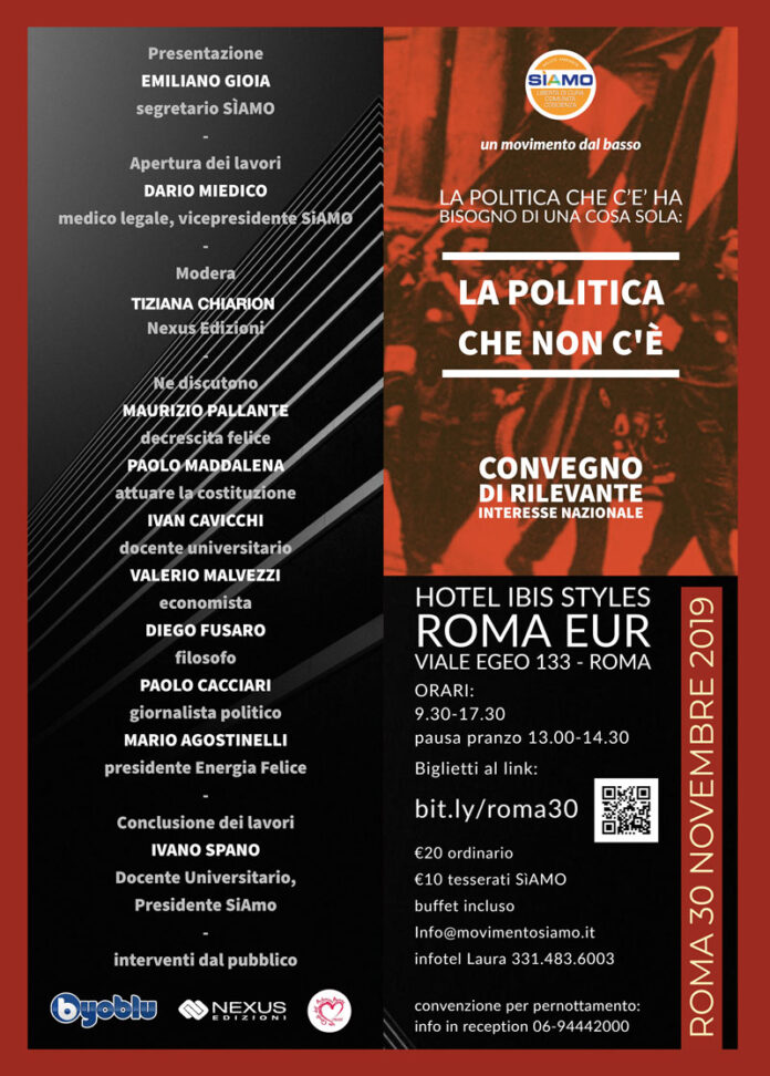 Ispirato dalle idee raccolte dal prof. Ivano Spano nel suo ultimo libro “Per l’auto governo della società civile” (Nexus Edizioni), il convegno metterà a confronto relatori di rilevanza nazionale nell'intento di discutere una proposta politica che potrebbe finalmente permettere il tanto agognato cambiamento di sistema radicale del nostro Paese. Al dibattito parteciperanno Maurizio Pallante della Decrescita Felice, Paolo Maddalena di Attuare la Costituzione, Ivan Cavicchi Docente universitario, Valerio Malvezzi Economista, Diego Fusaro Filosofo, Paolo Cacciari Giornalista politico, Mario Agostinelli Presidente Energia felice. Concluderà i lavori Ivano Spano Docente universitario, Presidente SiAmo e Democrazia Locale.
