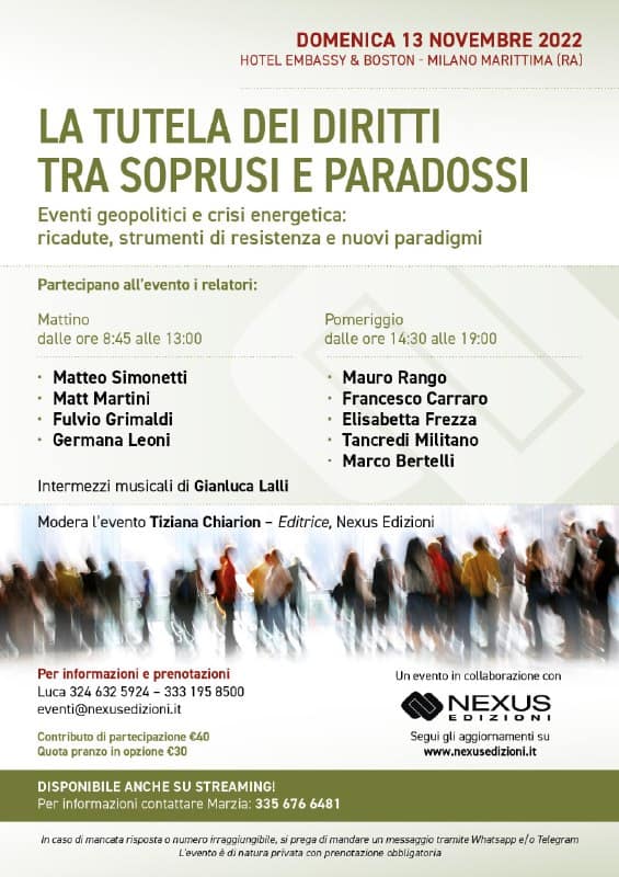 Si è svolto domenica 13 novembre, presso l’Hotel Embassy & Boston di Milano Marittima, l’evento ‘La tutela dei diritti tra soprusi e paradossi’. Un’intera giornata di interventi con relatori d’eccezione: nella mattinata il taglio giornalistico, storico-politico ha visto un confronto tra Matteo Simonetti, Flavio Grimaldi, Germana Leoni e Tom Bosco; nel pomeriggio standing ovation per Mauro Rango, a seguire Francesco Carraro, Elisabetta Frezza, Marco Bertelli e Tancredi Militano. Sono state proposte dieci ore ininterrotte d’informazione per riflettere, assimilare e meglio comprendere il momento attuale, il tutto allietato dalle parole in musica eseguite da un magistrale Gianluca Lalli. L’evento è stato curato e moderato da Tiziana Chiarion.